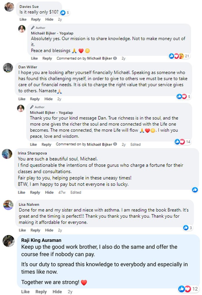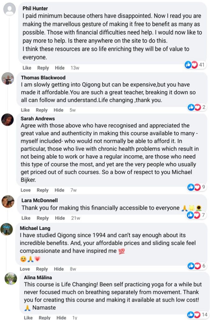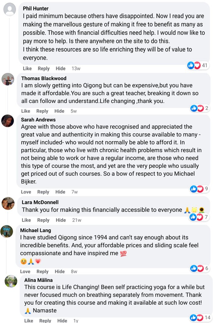 We provide everyone with natural and powerful ways to stay centered and train body & mind, whether one can afford it or not. Breathwork, Meditation & QiGong make you realize your wonderful power within, the power to observe, heal, manifest, and live a life full of abundance and satisfaction. A better world happens when we all have access to those self-care techniques, find our unique strength, and use it to help others.
